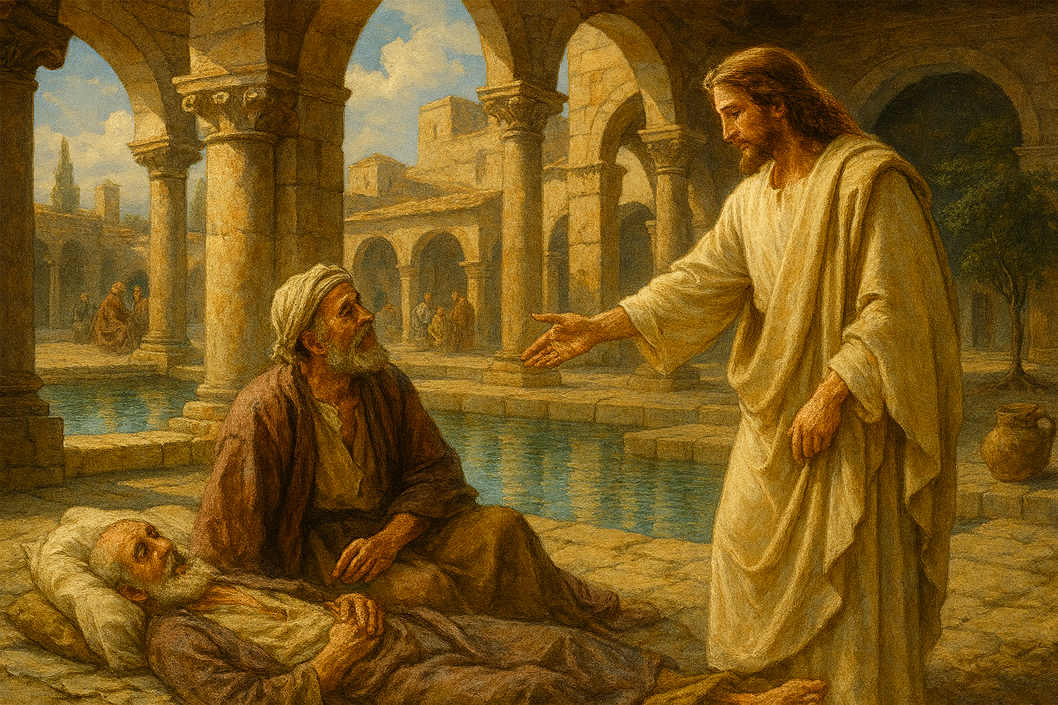 “耶稣看见他躺着,知道他病了许久,就问他说:你要痊愈么?”