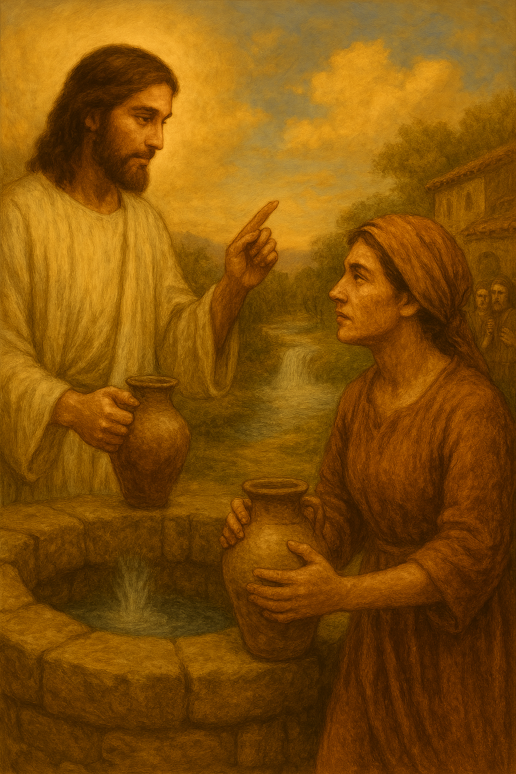 当时耶稣走路困乏,又饿又累,就坐在井旁。约翰说,有一个撒玛利亚的妇人来打水;耶稣对她说:“请你给我水喝。”